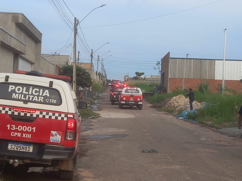 Viaturas da Polícia Militar do Pará reforçaram o cerco e o isolamento no bairro Jardim Tropical, em Xinguara, durante a operação que garantiu a segurança dos moradores e o desfecho sem vítimas. (Foto: PMPA)