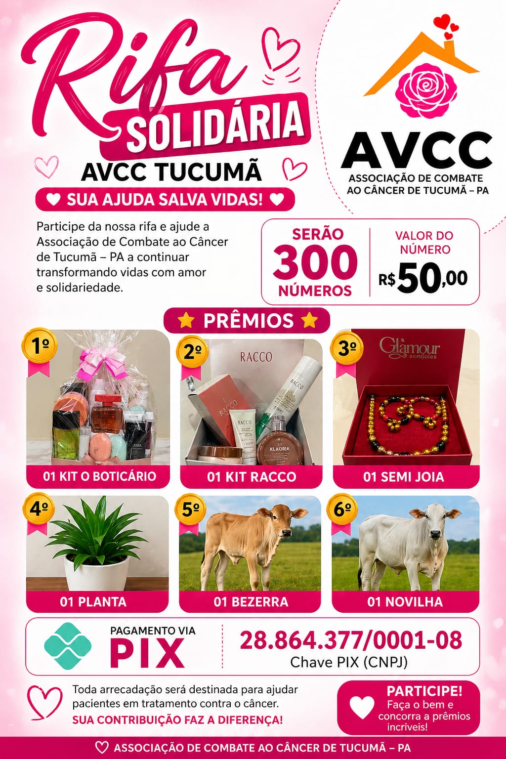 A Associação Voluntária de Combate ao Câncer de Tucumã (AVCC), no Sul do Pará, precisa de ajuda para continuar as atividades de apoio aos pacientes oncológicos. Para isso, está promovendo uma rifa solidária, com cada número no valor de R$ 50. São 300 números disponíveis e assim que todos forem vendidos, uma live será anunciada para o sorteio. Há vários prêmios disponíveis e quem colaborar, estará ajudando a salvar vidas e dar bem-estar e dignidade a quem enfrenta uma doença tão séria.