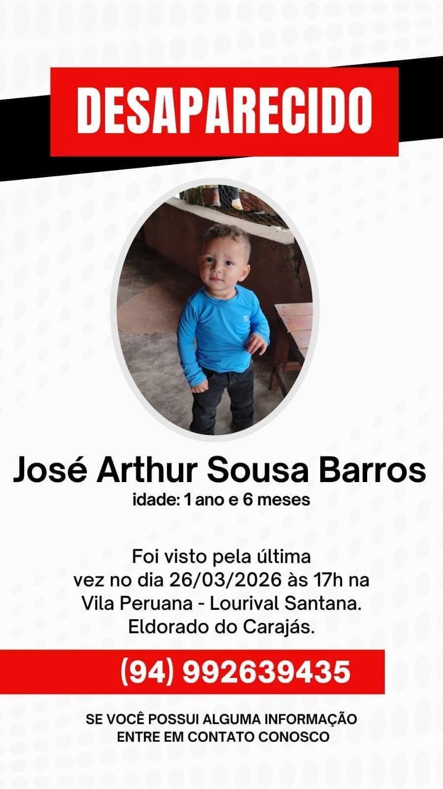 As buscas por José Arthur Sousa Barros, de 1 ano e 6 meses, chegam ao sexto dia nesta quarta-feira, 1° de abril. O bebê desapareceu no final da tarde da última quinta-feira (26 de março), na vila Peruana, área do assentamento Lourival Santana, zona rural de Eldorado do Carajás, no Sudeste do Pará. Uma força-tarefa foi montada para localizá-lo, envolvendo a Polícia Militar, Polícia Civil, prefeitura, bombeiros e voluntários da comunidade. Informações que possam ajudar podem ser repassadas pelos telefones (94) 99263-9435, 190 e 181.