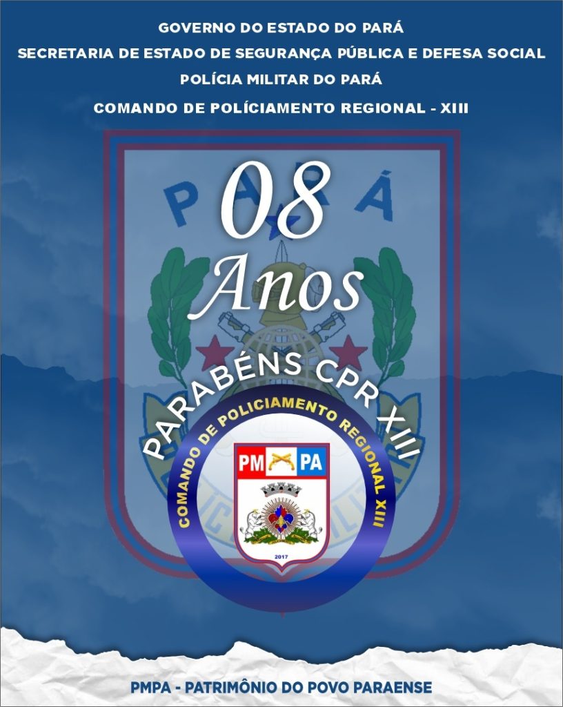 Nesta quarta-feira, 29, o Comando de Policiamento Regional XIII (CPR XIII) da Polícia Militar do Estado do Pará (PMPA) comemora 8 anos de criação.