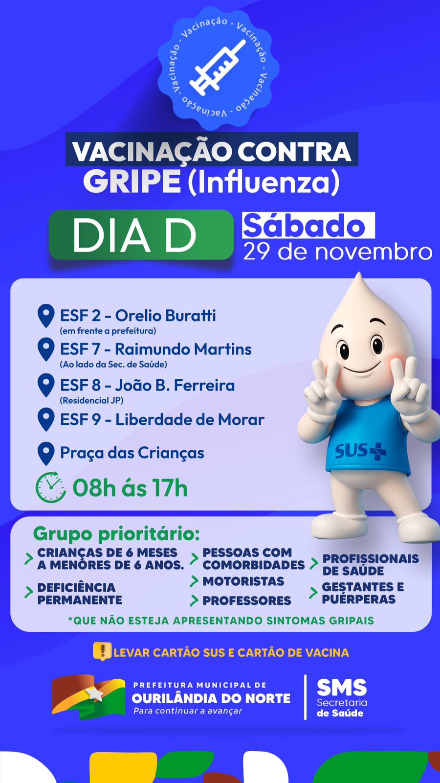 A Secretaria Municipal de Saúde de Ourilândia do Norte promove neste sábado, 29, o Dia D de vacinação contra a gripe (Influenza). A mobilização ocorre das 08h às 17h em cinco pontos estratégicos da cidade, com o objetivo de ampliar a cobertura vacinal entre os grupos prioritários.