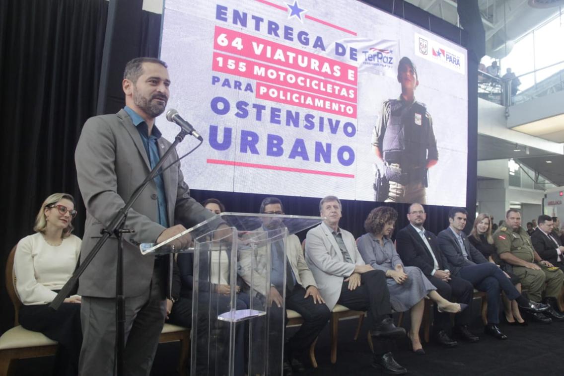 O governador Helder Barbalho e o comandante-geral da Polícia Militar, coronel José Dilson Melo de Souza Júnior, participam do evento, realizado no Hangar Convenções e Feiras da Amazônia.