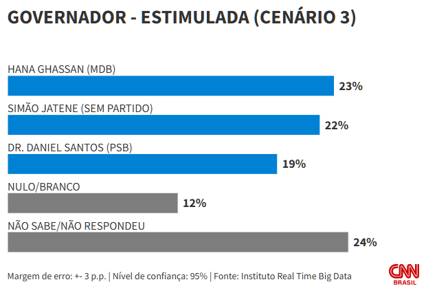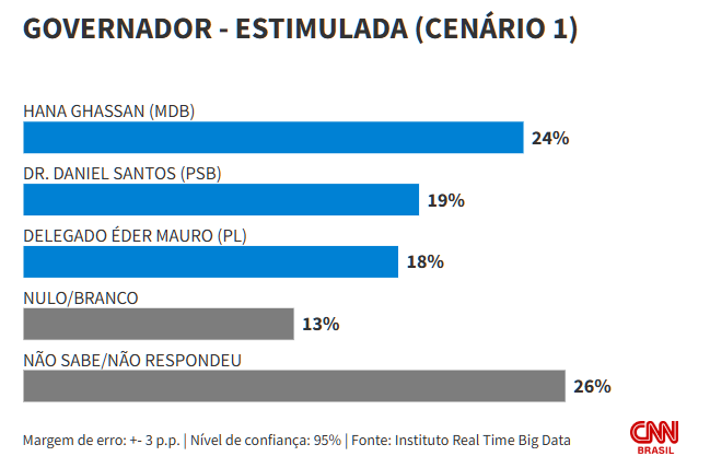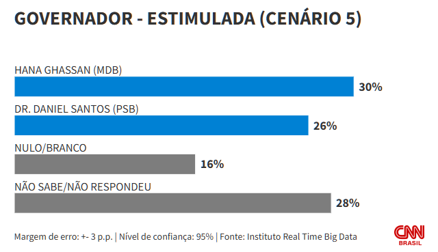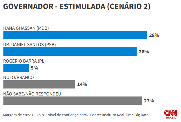 Em um outro cenário, Hana aparece com 28% das intenções de voto, seguida por Daniel Santos, com 26%. O deputado estadual Rogério Barra (PL) vem em terceiro, com 5%.