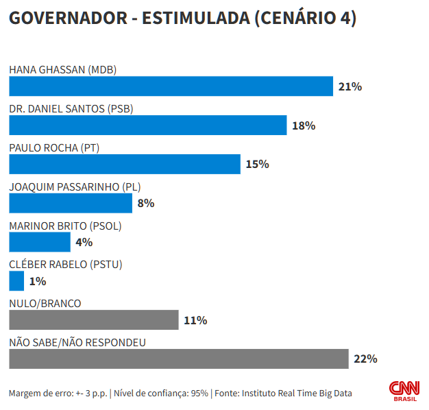 Em um cenário mais amplo, Hana lidera com 21%, Daniel tem 18%, Paulo Rocha (PT) aparece com 15%, Joaquim Passarinho (PL) com 8%, Marinor Brito (PSOL) com 4% e Cleber Rabelo (PSTU) com 1%.