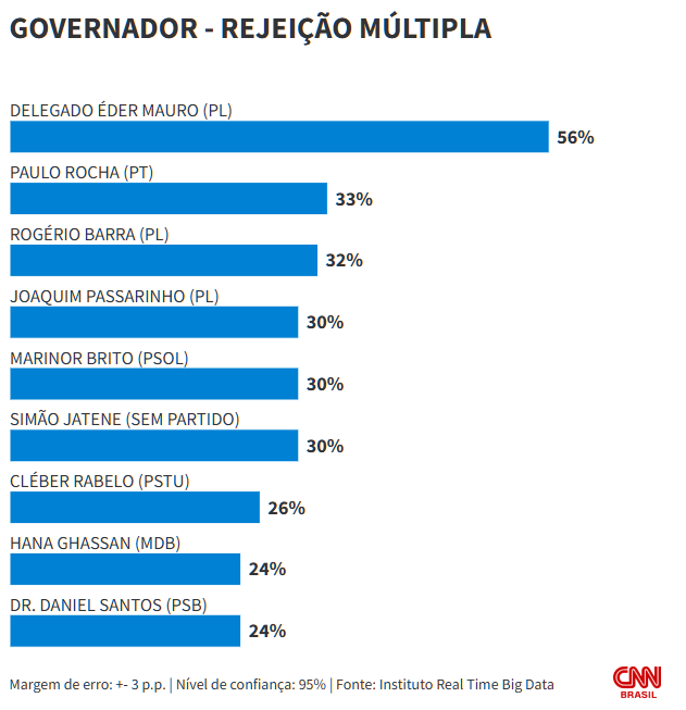 A pesquisa também testou a rejeição dos candidatos. Éder Mauro apareceu no topo da lista com 56% de rejeição, seguido de Paulo Rocha (PT), com 33%. O deputado estadual Rogério Barra ocupa o 3º lugar, com 32%.