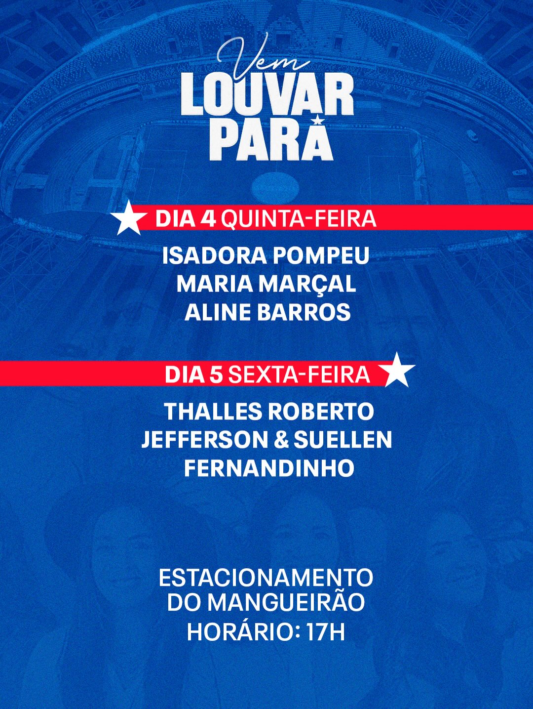 O governador Helder Barbalho (MDB) anunciou, pelas redes sociais nesta quarta-feira, 26, a realização de mais uma edição do “Vem Louvar Pará”, que acontecerá nos dias 4 e 5 de dezembro, no estacionamento do Mangueirão, em Belém. O evento, totalmente gratuito, promete reunir milhares de pessoas em dois dias de celebração, fé e música.
