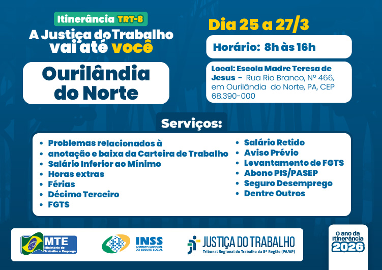 O Tribunal Regional do Trabalho da 8ª Região (PA/AP) segue com os atendimentos do programa Justiça do Trabalho Itinerante em Ourilândia do Norte, no Sul do Pará, até esta sexta-feira (27). Os serviços jurídicos são gratuitos à população, das 8h às 16h, na escola Madre Teresa de Jesus, localizada na rua Rio Branco, nº 466. Basta levar a documentação para buscar o atendimento necessário, sem a necessidade de se deslocar a outros municípios.