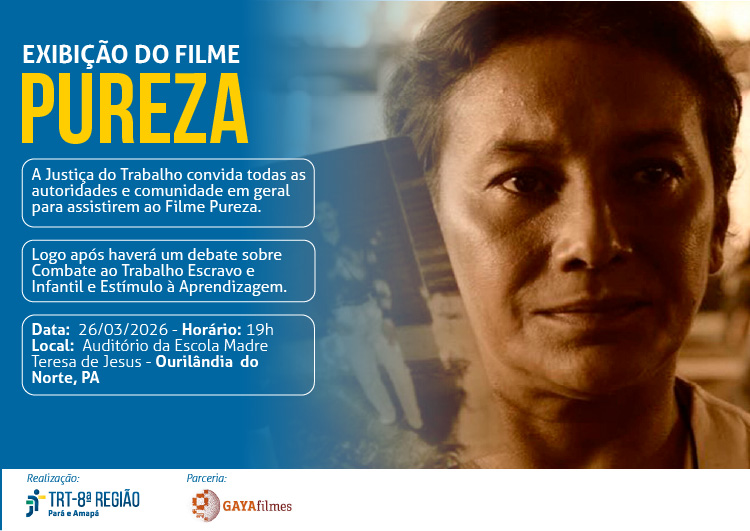 Como parte da programação, será exibido o filme “Pureza”, protagonizado pela atriz paraense Dira Paes, nesta quinta-feira (26), às 19h, no auditório da escola Madre Teresa de Jesus. A obra aborda o trabalho rural e os direitos trabalhistas, inspirada em fatos reais, retratando situações de exploração e condições análogas à escravidão.