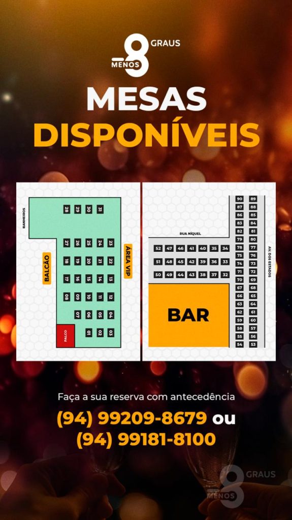 As reservas podem ser feitas pelos telefones (94) 99209-8679 e (94) 99181-8100. O Réveillon do Menos 8 Graus surge como uma das opções para quem busca comemorar o Ano-Novo com amigos, música ao vivo e um ambiente preparado para a ocasião.