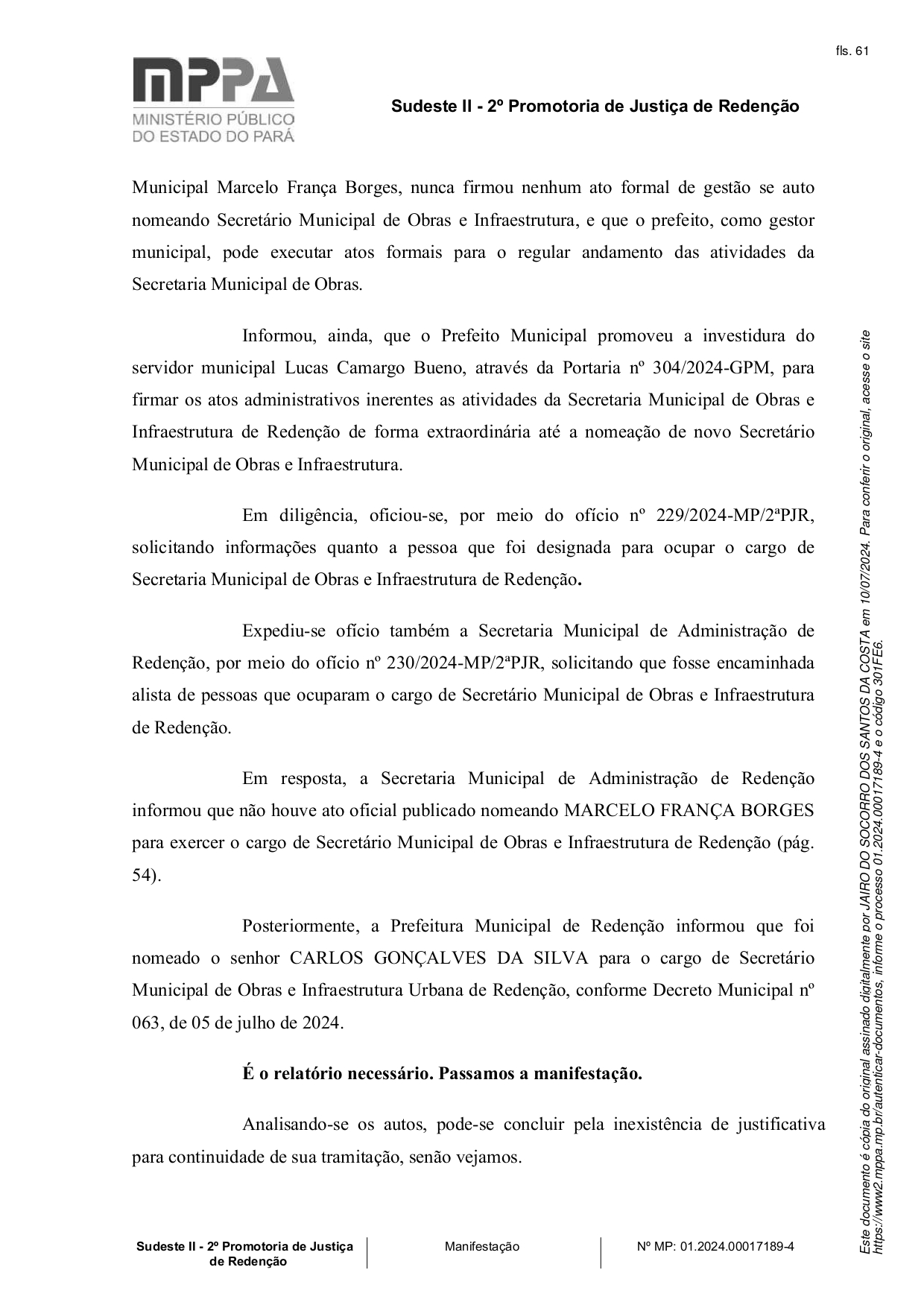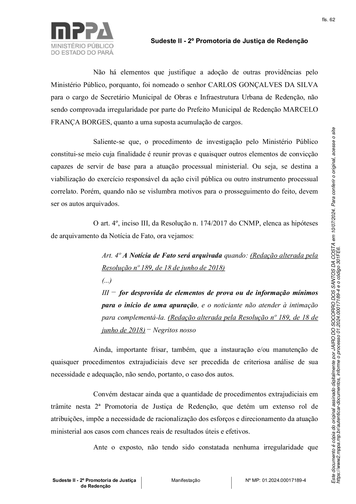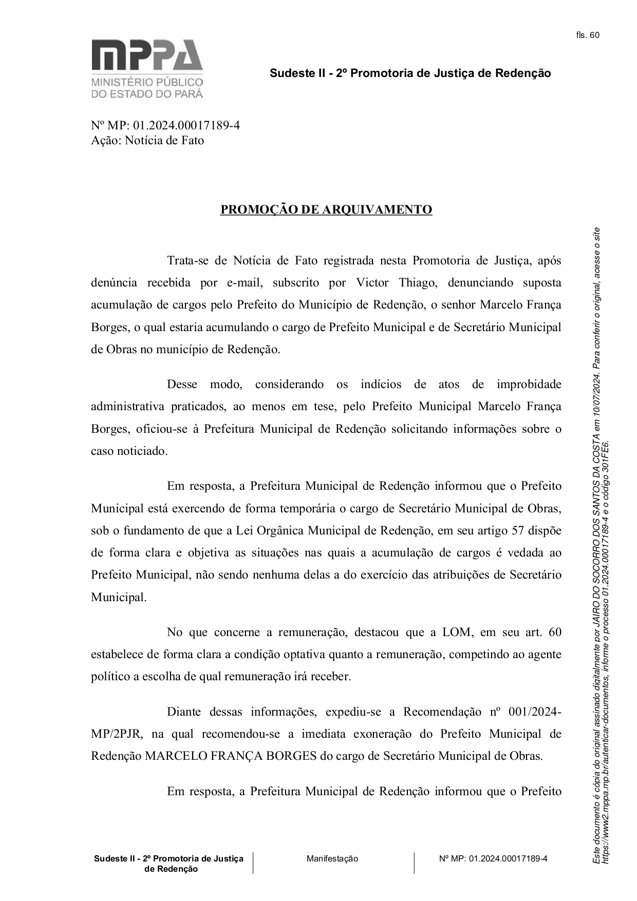 Com o pedido de informações feito ao MPPA, via assessoria de imprensa, foi gerada uma notícia de fato. Após mais de um mês de apuração, a 2ª Promotoria de Justiça de Redenção deu retorno à Redação do Fato Regional, explicando não ter encontrado irregularidades na medida do prefeito Marcelo Borges. No entanto, foi feita a recomendação nº 001/2024-MP/2PJR, para que o prefeito deixasse o cargo que, segundo os comunicadores, ele havia assumido.
