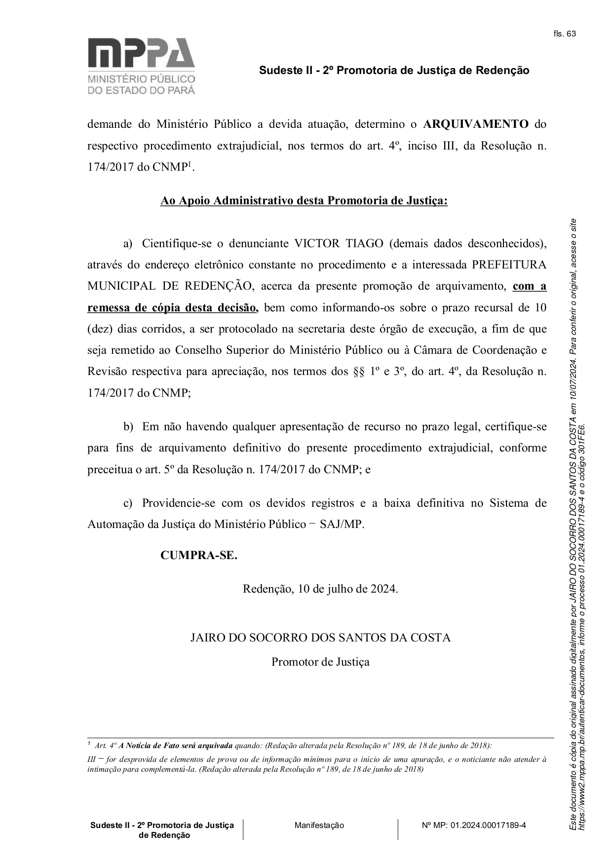 Assim, segundo ofício enviado à Prefeitura e à Redação do Fato Regional, o promotor de Justiça Jairo do Socorro dos Santos da Costa informou que não haveria novos procedimentos e a investigação seria arquivada.