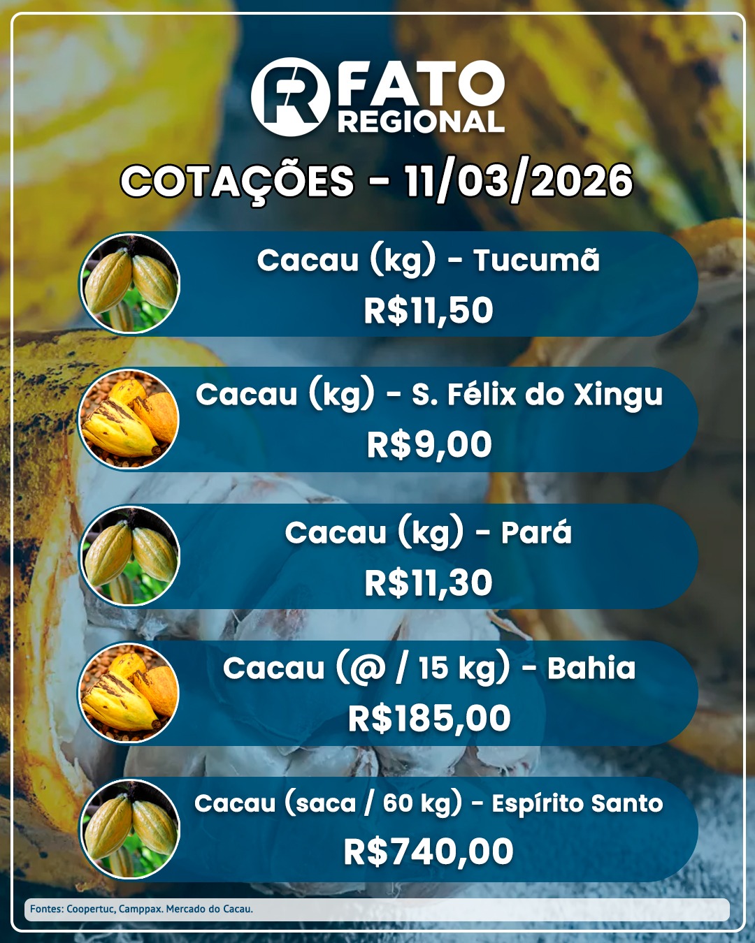 Nesta quarta-feira (11), a Coopertuc, de Tucumã, registrou o preço a R$ 11,50 o quilo. Já a Camppax, de São Félix do Xingu, apontou o quilo a R$ 9. Pelas informações do Mercado do Cacau, a cotação estadual do Pará ficou em R$ 11,30, enquanto que a arroba da Bahia (15 kg) ficou em R$ 185 e a saca do Espírito Santo (60 kg) marcou R$ 740. O Pará responde por mais de 51% da produção nacional e tem as polpas e amêndoas reconhecidas, mundialmente, como de alta qualidade.