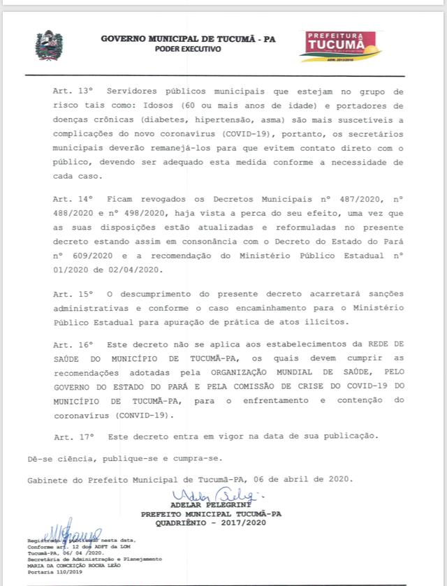 O prefeito de Tucumã, Adelar Pelegrini, publicou novo decreto nesta segunda-feira, 06, que permite abertura parcial do comércio local, seguindo recomendações do Ministério Público estadual, como forma de evitar aglomerações devido à pandemia do novo coronavírus.