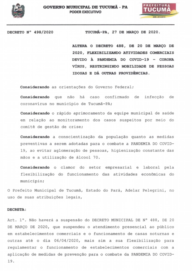 Representantes do comércio de Tucumã, sudeste paraense, estiveram reunidos na manhã desta sexta-feira, 27, com o prefeito do município, Adelar Pelegrini e, com o secretário de saúde Raphael Antônio, para tratar sobre a reabertura do comércio local, fechado desde o último dia 20 de março, com a finalidade de combater e prevenir o Coronavírus.