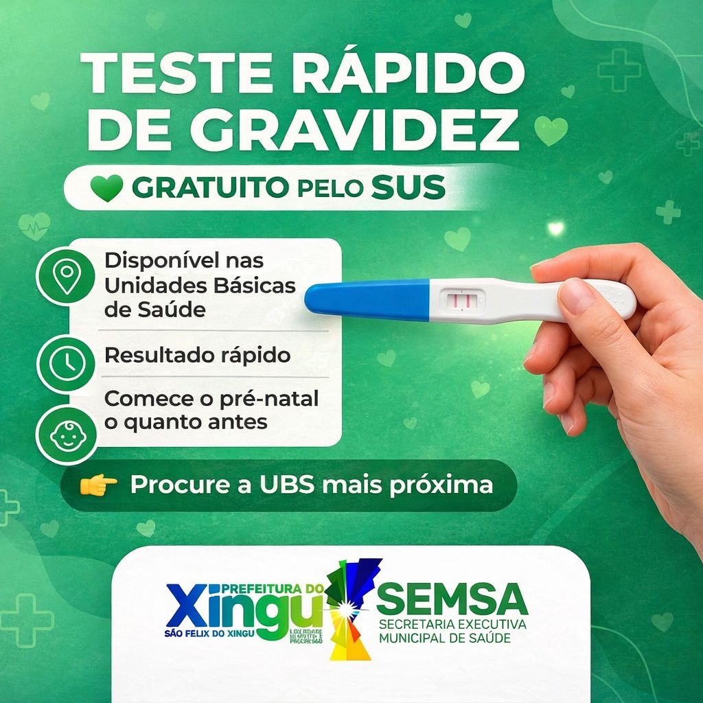 A Prefeitura de São Félix do Xingu, por meio da Secretaria Executiva Municipal de Saúde (Semsa), está disponibilizando gratuitamente o teste rápido de gravidez nas Unidades Básicas de Saúde (UBS) do município. A iniciativa reforça o compromisso da gestão municipal com a saúde da mulher e com o cuidado integral desde os primeiros momentos da gestação.