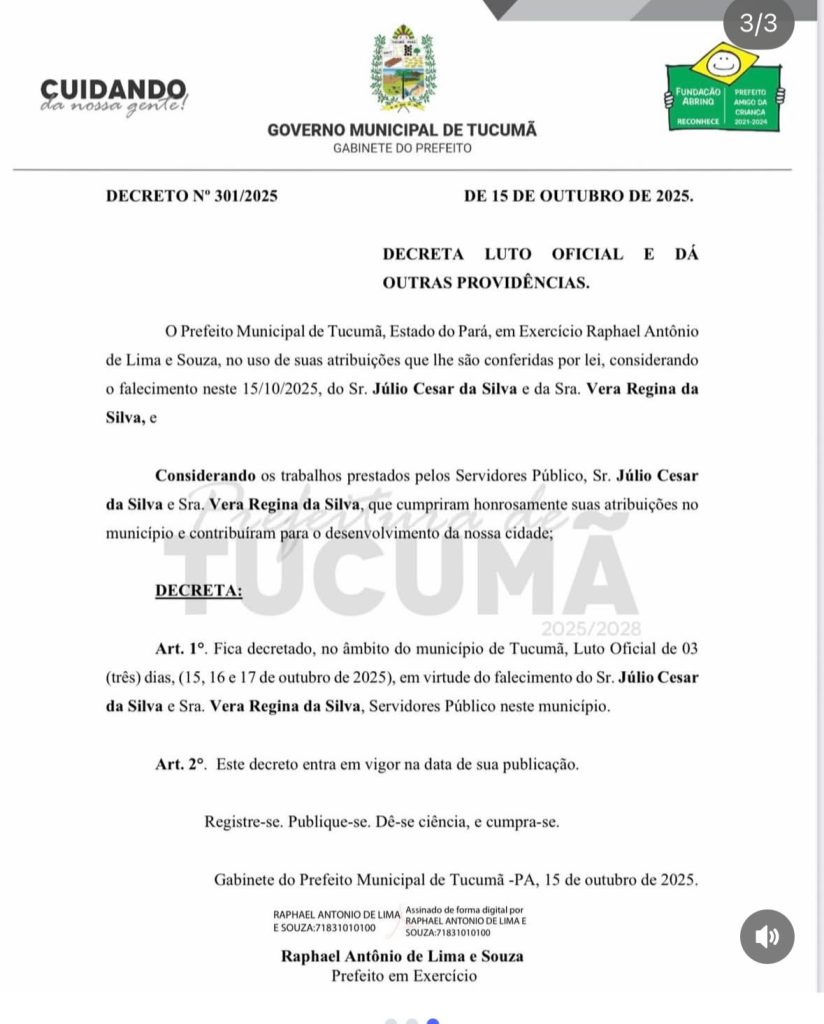A Prefeitura Municipal de Tucumã decretou três dias de luto oficial em razão do falecimento dos irmãos Vera Regina da Silva e Júlio César da Silva, ambos servidores públicos do município. O decreto nº 301/2025 foi publicado nesta quarta-feira (15), e é assinado pelo prefeito em exercício, Raphael Antônio de Lima e Souza (Rafael da Saúde)