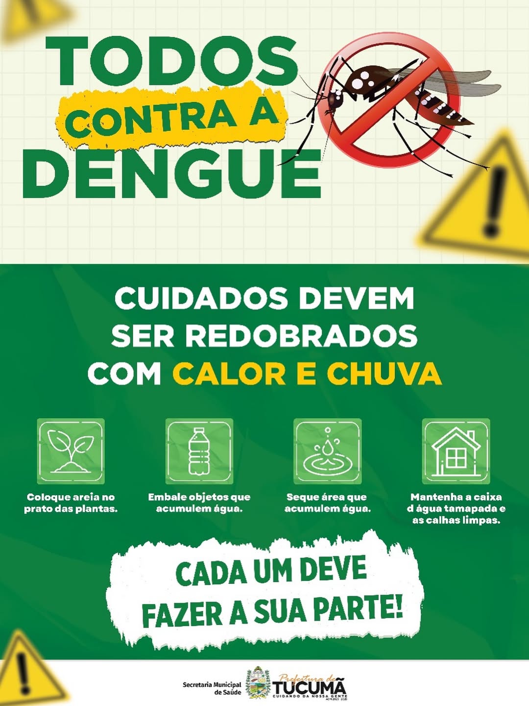 A Prefeitura de Tucumã, por meio da Secretaria Municipal de Saúde, segue firme na campanha “Todos contra a Dengue”, com o objetivo de conscientizar a população sobre a importância de eliminar possíveis criadouros do mosquito Aedes aegypti, transmissor da dengue, zika e chikungunya.