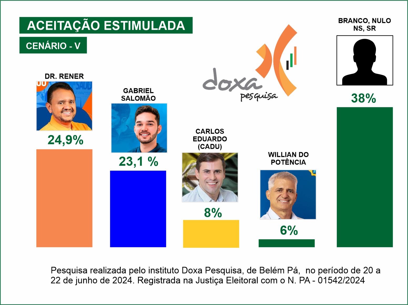 Na aceitação estimulada, quando os candidatos são apresentados aos eleitores entrevistados, o empate técnico é ainda mais visível. Dr. Rener aparece com 21,7% das intenções de voto e Gabriel Salomão com 21%, ou seja, menos de 1 ponto percentual de diferença. Mário Moreira teve 9% de menções e Leandro Onofre 8%. Willian do Potência e Cadu empataram em 6%. Os brancos e nulos e os que não sabem ou não responderam somaram 28,3%.