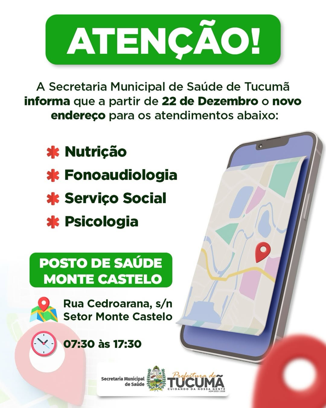 A Prefeitura de Tucumã, por meio da Secretaria Municipal de Saúde, informou a mudança de endereço dos atendimentos especializados de Nutrição, Fonoaudiologia, Serviço Social e Psicologia. A partir do dia 22 de dezembro, os serviços passam a ser ofertados em um novo local, com o objetivo de melhorar o acesso e a qualidade do atendimento à população.