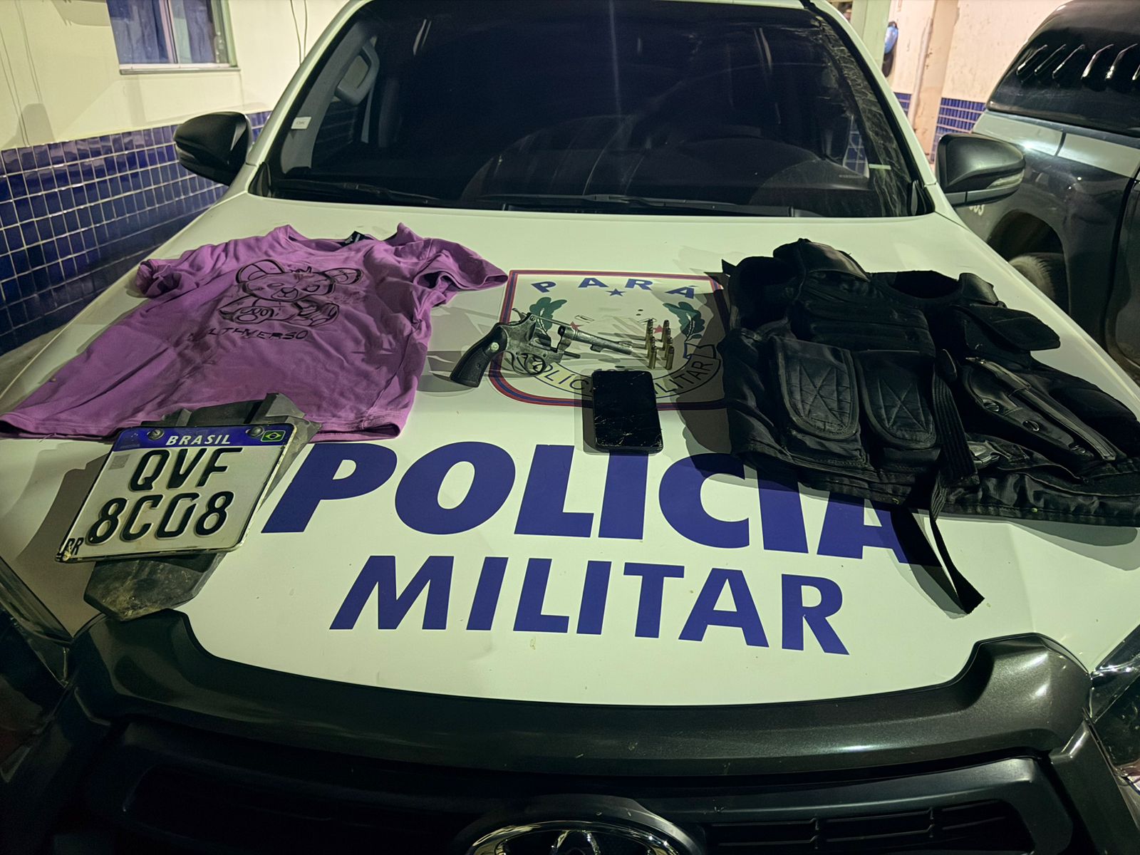 A camiseta de Rafael usada no assalto em Tucumã, a arma apreendida e o colete usado em homicídios investigados (Foto: 36º BPM)