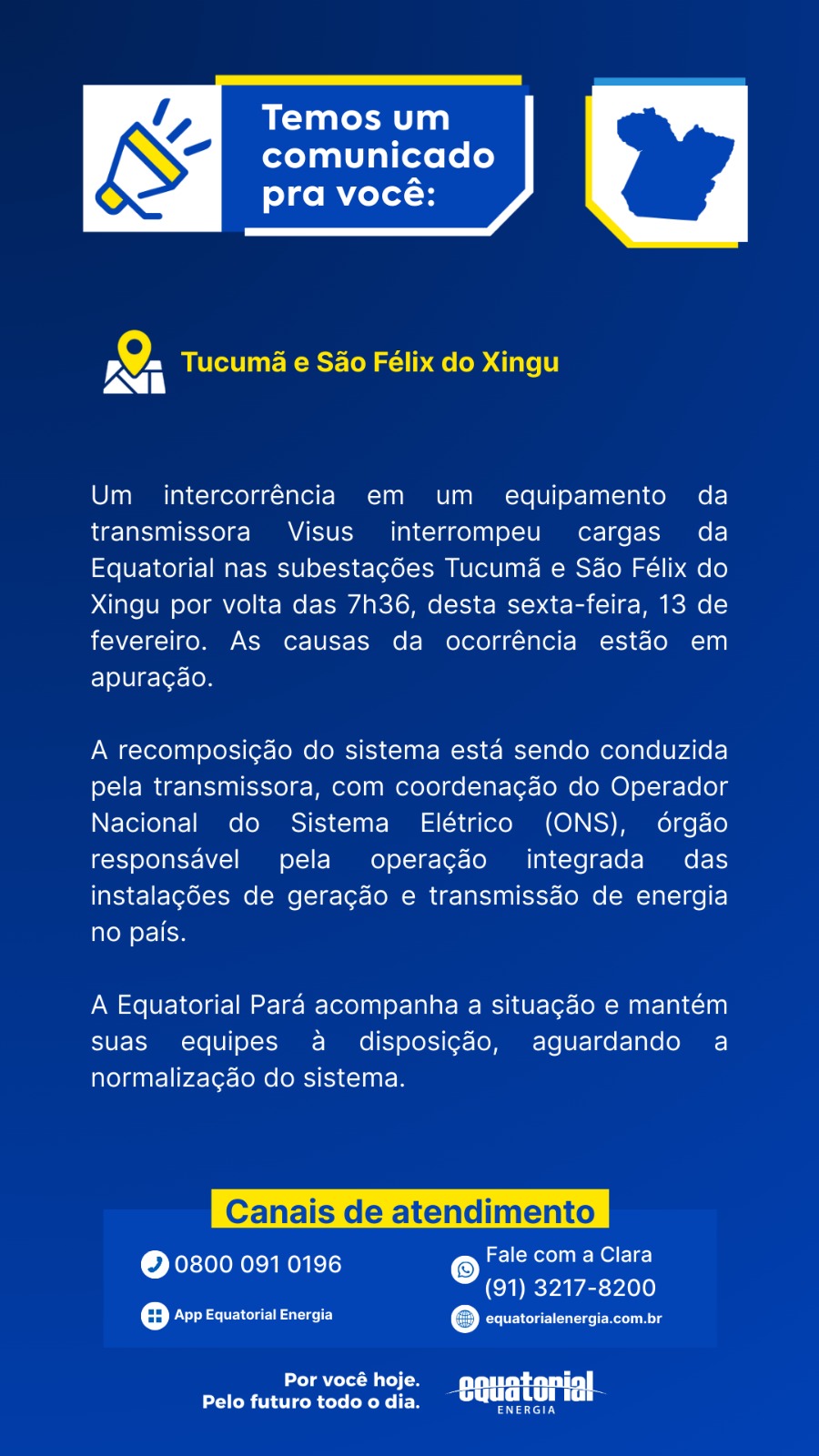 Uma falha em equipamentos das transmissora Visus, cuja rede atende a usina de Onça Puma, em Ourilândia do Norte, no Sul do Pará, provocou uma interrupção das cargas da Equatorial. Isso provocou falhas nas subestações de Tucumã e São Félix do Xingu, deixando municípios da região da PA-279 sem energia ou com oscilações. O incidente ocorreu devido às chuvas e foi registrado por volta de 7h36 desta sexta-feira (13).