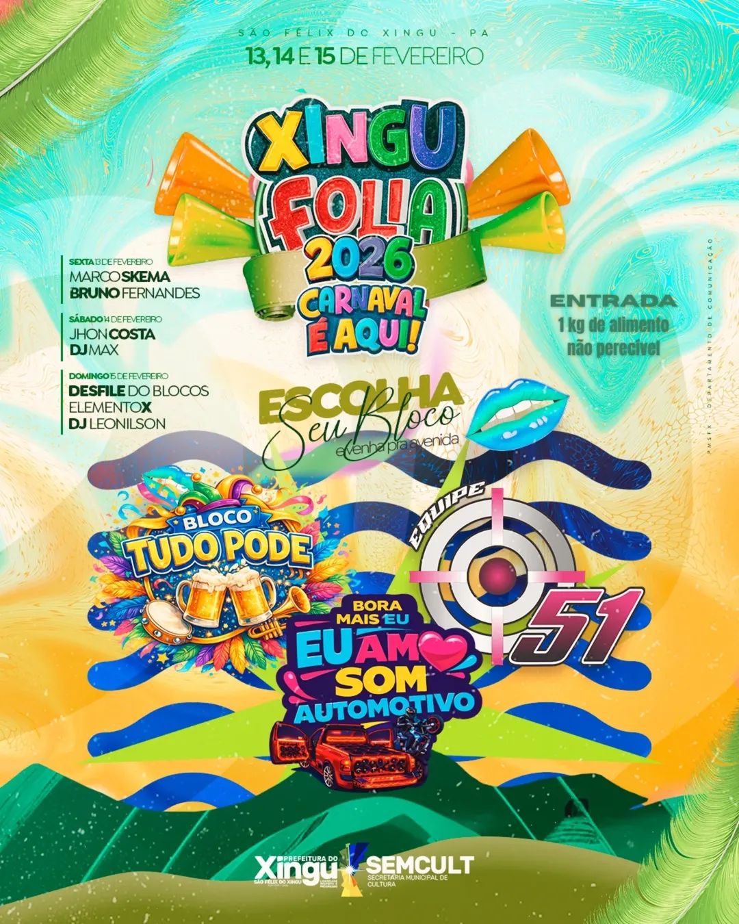 Entre os blocos confirmados estão “Tudo Pode”, “Equipe 51” e “Bora Mais Eu – Eu Amo Som Automotivo”, reforçando a diversidade e a energia do carnaval xinguense.